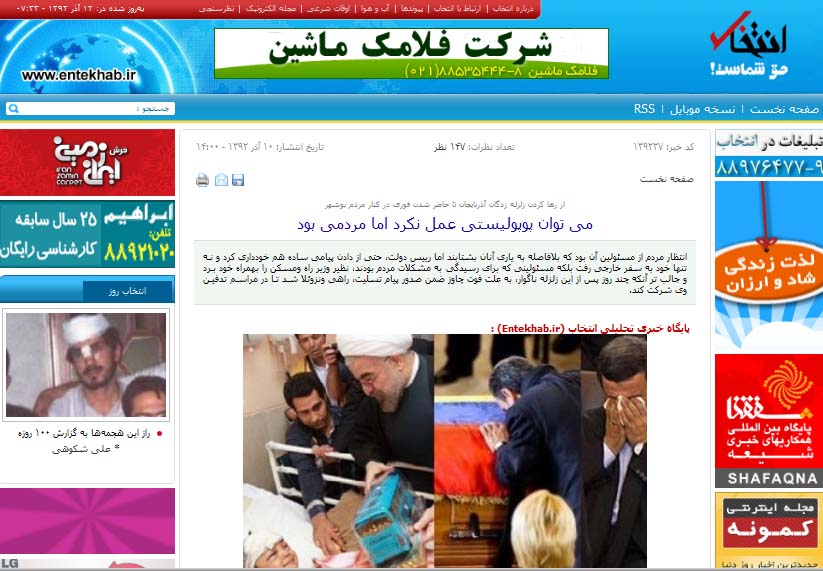 اما براي مردمي که هشت سال رييس جمهور خود را در ميان مردم ديدهاند و با او حشر و نشر داشتهاند، به او دست دادهاند، با او قدم زدهاند، صحبت کردهاند و ... سفر رييس جمهور به منطقه زلزله زده يک اتفاق طبيعي و معمول است. اما برخی سايتهای حامي دولت يازدهم با آب و تاب فراوان اين سفر را پوشش دادند تا نشان دهند براي آنها چنين امري چقدر عجيب است که ميتواند ارزش خبري در حد صفحه يک روزنامه ايران (نگاه کنيد به مطلب وقتي رئيس جمهور آمد در صفحه اول اين روزنامه در تاريخ 10 آذر 92) و تيتر يک سايت انتخاب داشته باشد!!