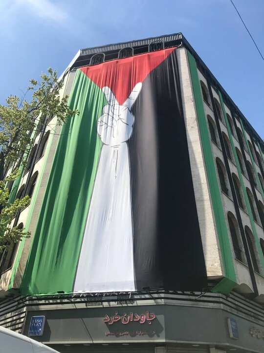 نصب پرچم بزرگ فلسطین در تقاطع خیابان قدس