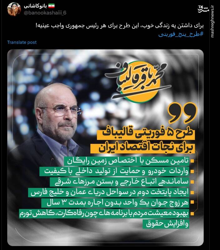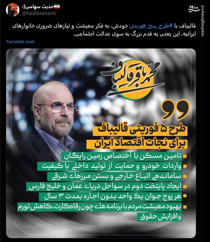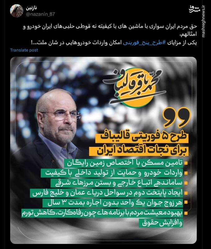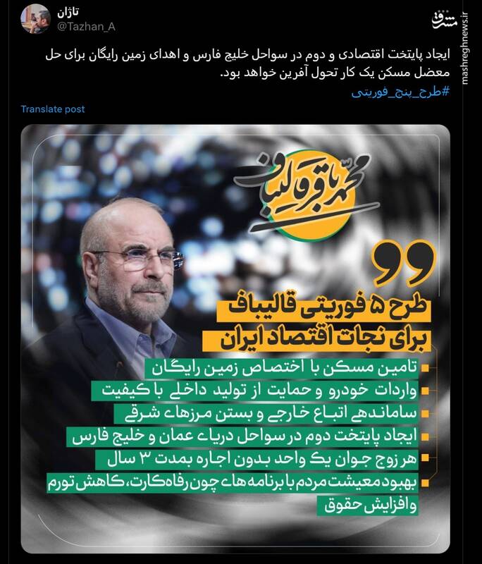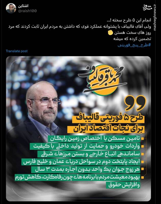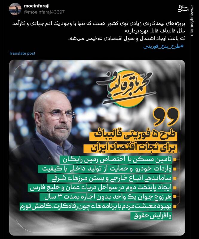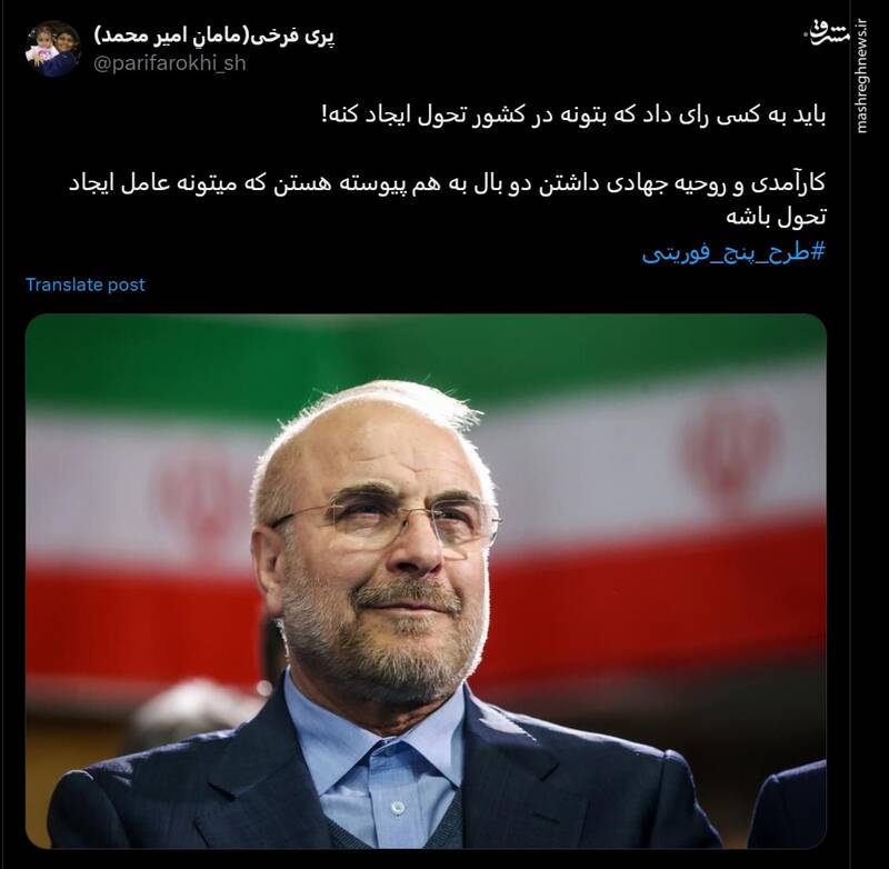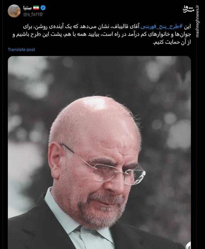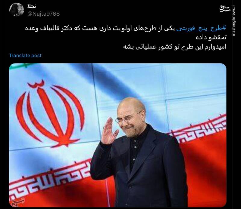 علاوه بر این فضای مجازی هم به استقبال این طرح رفت. در روزهای اخیر هشتگهای مشابه به «طرح پنج فورتی قالبیباف» در شبکه اجتماعی توئیتر ترند شده است.