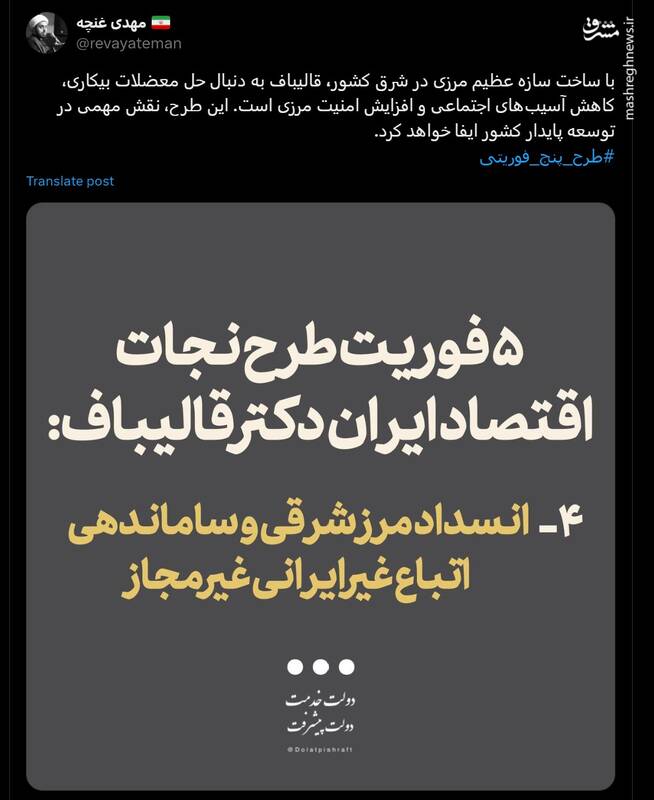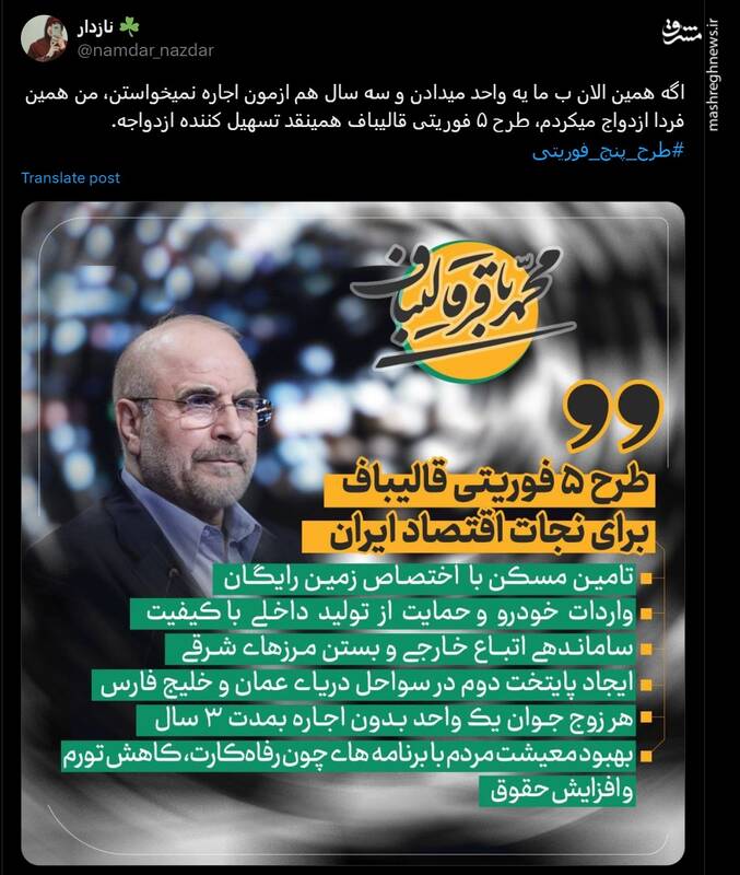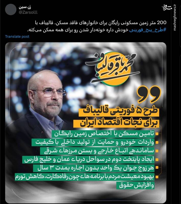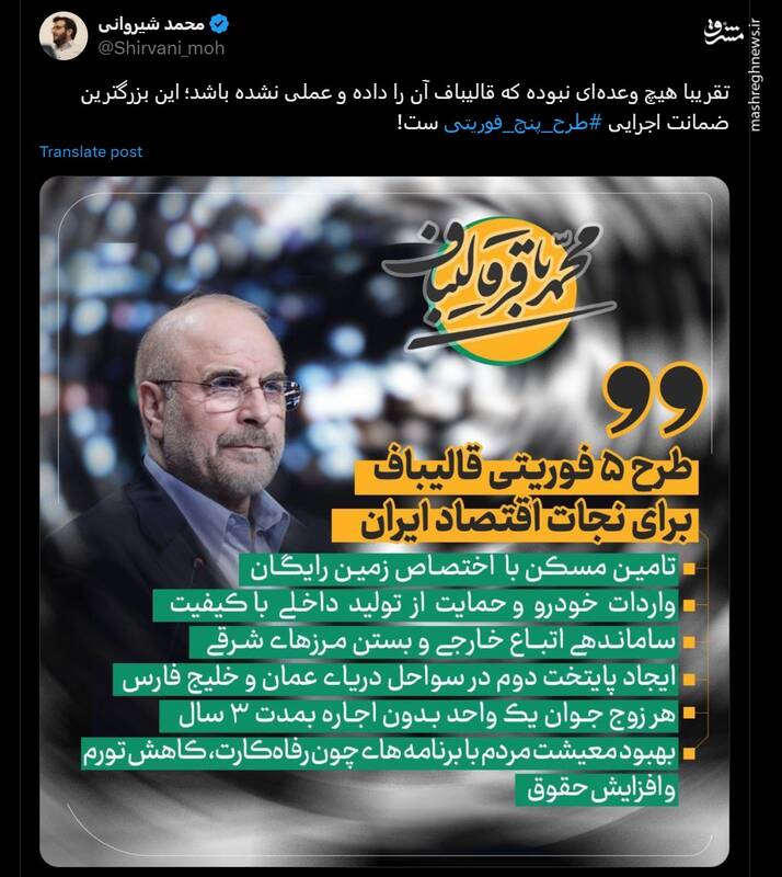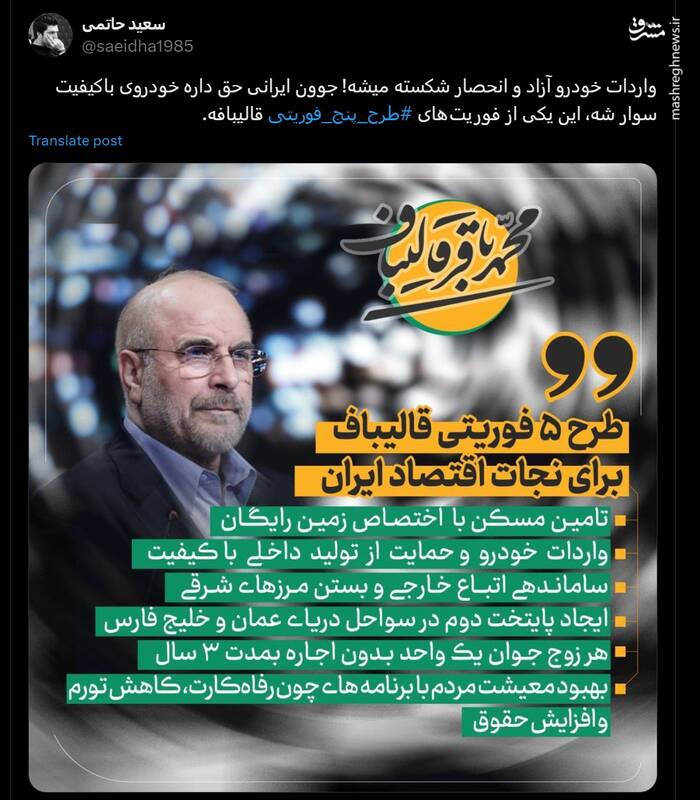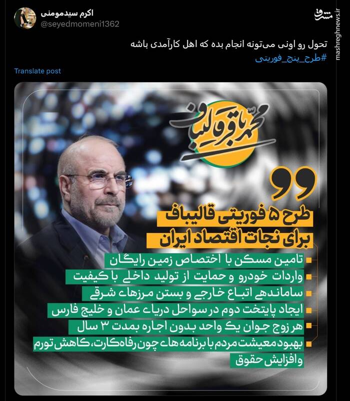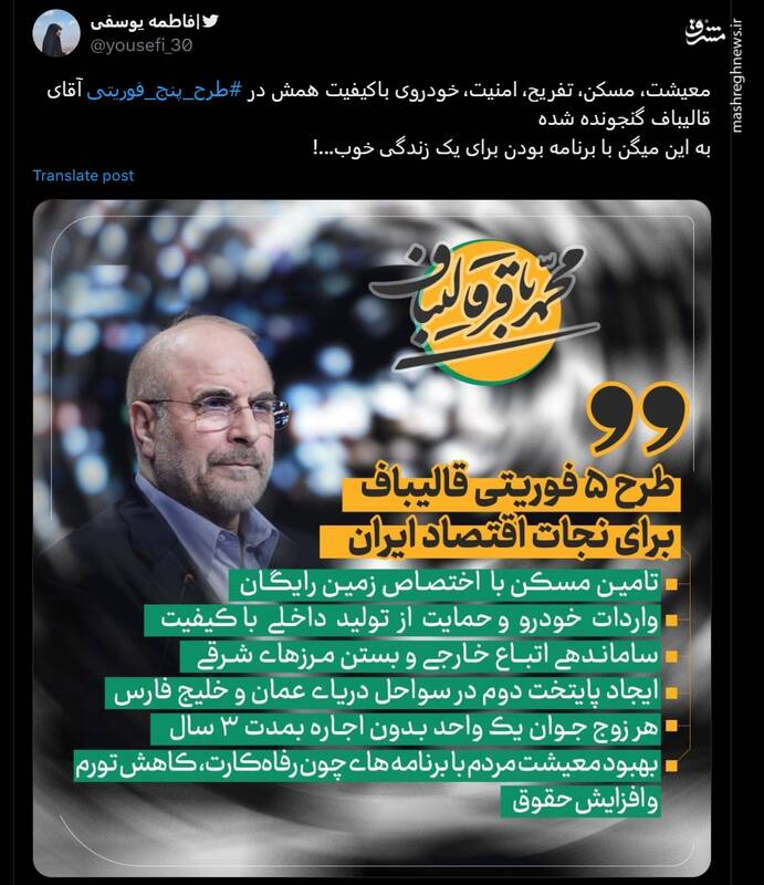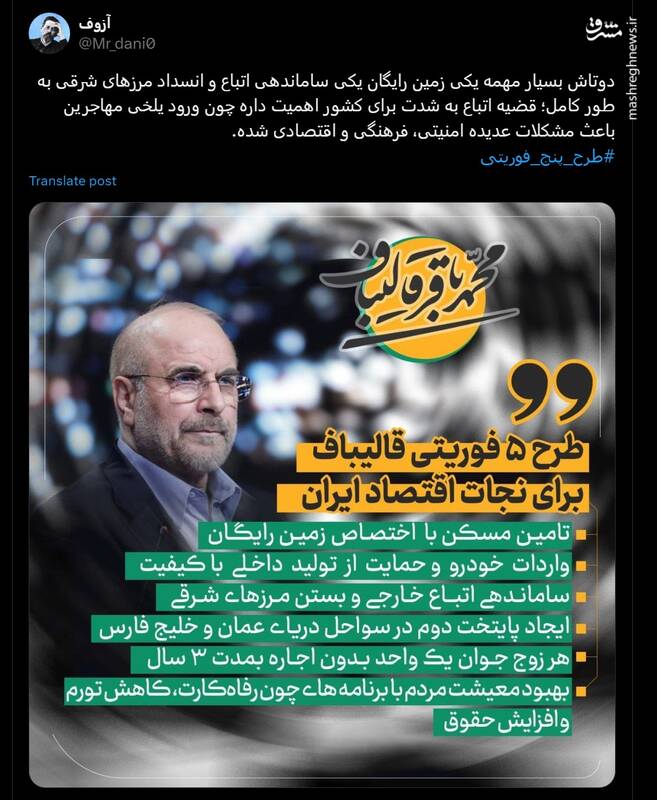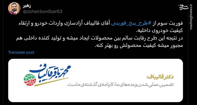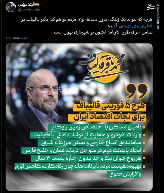 علاوه بر این فضای مجازی هم به استقبال این طرح رفت. در روزهای اخیر هشتگهای مشابه به «طرح پنج فورتی قالبیباف» در شبکه اجتماعی توئیتر ترند شده است.
