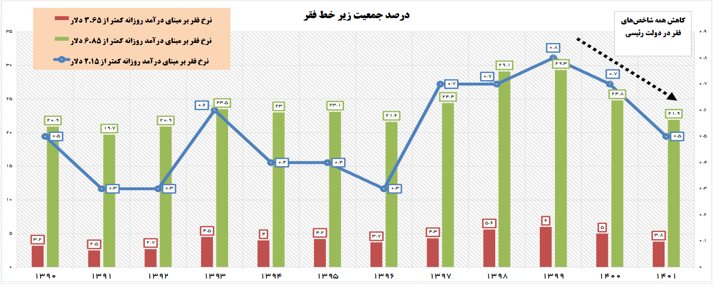 در هر سه شاخص، نرخ فقر در ایران در پایان دولت روحانی به بدترین وضع خود رسید و در ۲ سال نخست دولت رئیسی به شدت نزولی شد و از شمار فقرا به طرز فاحشی کاسته شد.