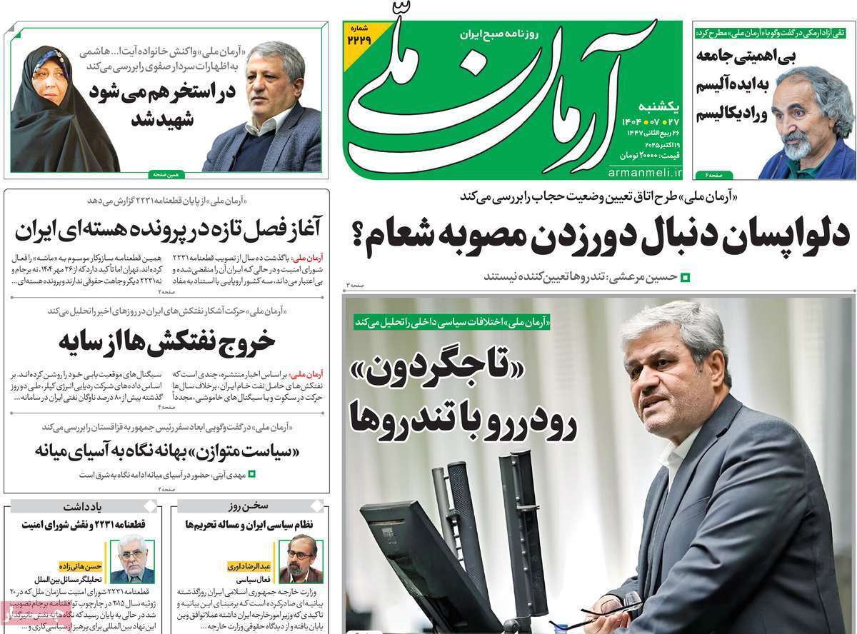 صفحه نخست روزنامههای یکشنبه ۲۷ مهرماه ۱۴۰۴