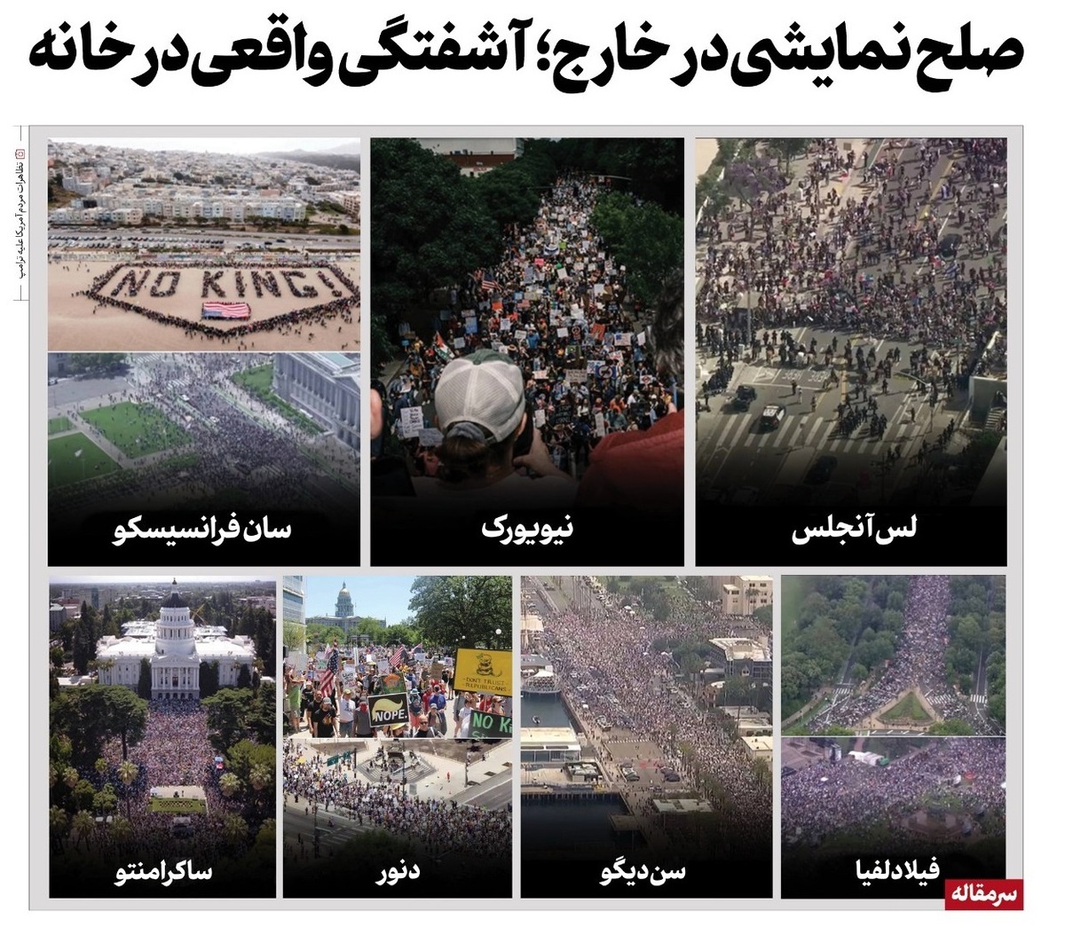 اعتراضات گسترده مردم آمریکا که از ۱۸ اکتبر ۲۰۲۵ شروع شد یکی از بزرگترین جنبشهای اعتراضی در تاریخ معاصر این کشور است. میلیونها شهروند، از نیویورک و شیکاگو گرفته تا روستاهای کوچک داکوتای شمالی، در اعتراض به سیاستهای اقتدارگرایانه ترامپ به خیابان آمدند و شعار «نه به پادشاه» سر دادند * دونالد ترامپ رئیسجمهور آمریکا در ماههای اخیر بهنوعی جبهه تقابل خود را به همه کشورهای جهان گسترش داده است. از ونزوئلا تا روسیه، ایران، چین و حتی متحدان غربی. در این میان ایران همواره به یکی از بخشهای ثابت همه سخنرانیهای ترامپ تبدیل شده و بهبهانههای مختلف به امور داخلی ایران گریزی میزند. این درحالی است که ترامپ در عرصه داخلی با چالشهای مختلفی مواجه است و گویی سعی دارد با این فرافکنیها بهنوعی افکار عمومی را از این چالشها به مسائل خارجی منحرف کند. رهبر معظم انقلاب اخیراً در دیدار قهرمانان و مدالآوران ورزشی و المپیادهای علمی جهانی به این مسئله اشاره و تأکید کردند: «.. شما چهکارهی دنیایید؟ چه ربطی به آمریکا دارد که ایران امکانات هستهای و صنعت هستهای دارد یا ندارد؟ این دخالتها، دخالتهای ناباب، ناجور، غلط و زورگویانه است. شنیدم در همهی ایالات آمریکا الان مردم در خیابانها دارند علیه او شعار میدهند؛ طبق این گزارشها، هفت میلیون جمعیت در شهرهای مختلف علیه این شخص دارند شعار میدهند. اگر شماها خیلی توانایی دارید، بروید اینها را آرام کنید! بروید اینها را ساکت کنید و به خانههایشان برگردانید.»