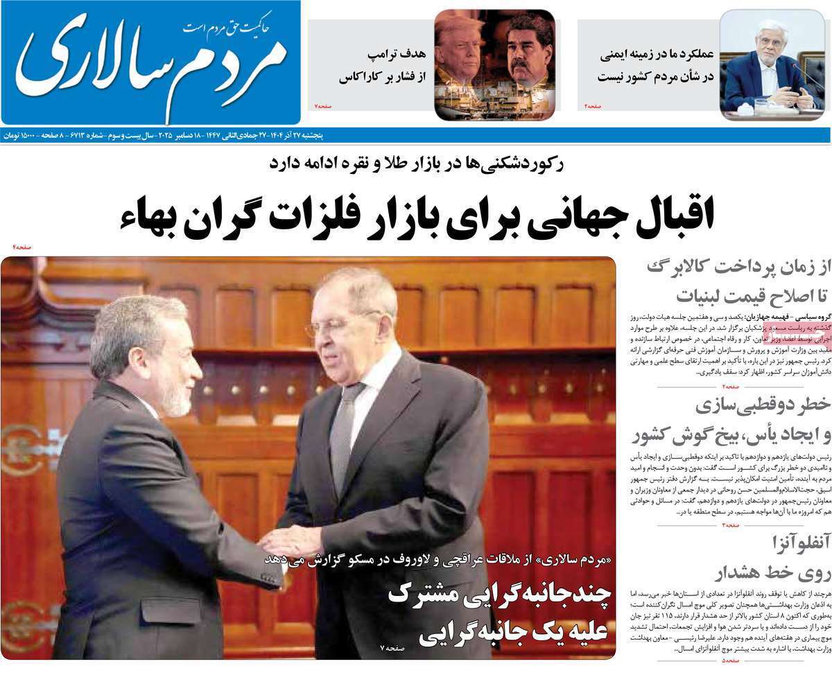 صفحه نخست روزنامه‌های پنجشنبه ۲۷ آذرماه ۱۴۰۴