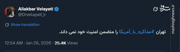 علی اکبر ولایتی در توئیتر نوشت: تهران مذاکره با آمریکا را متضمن امنیت خود نمی داند.