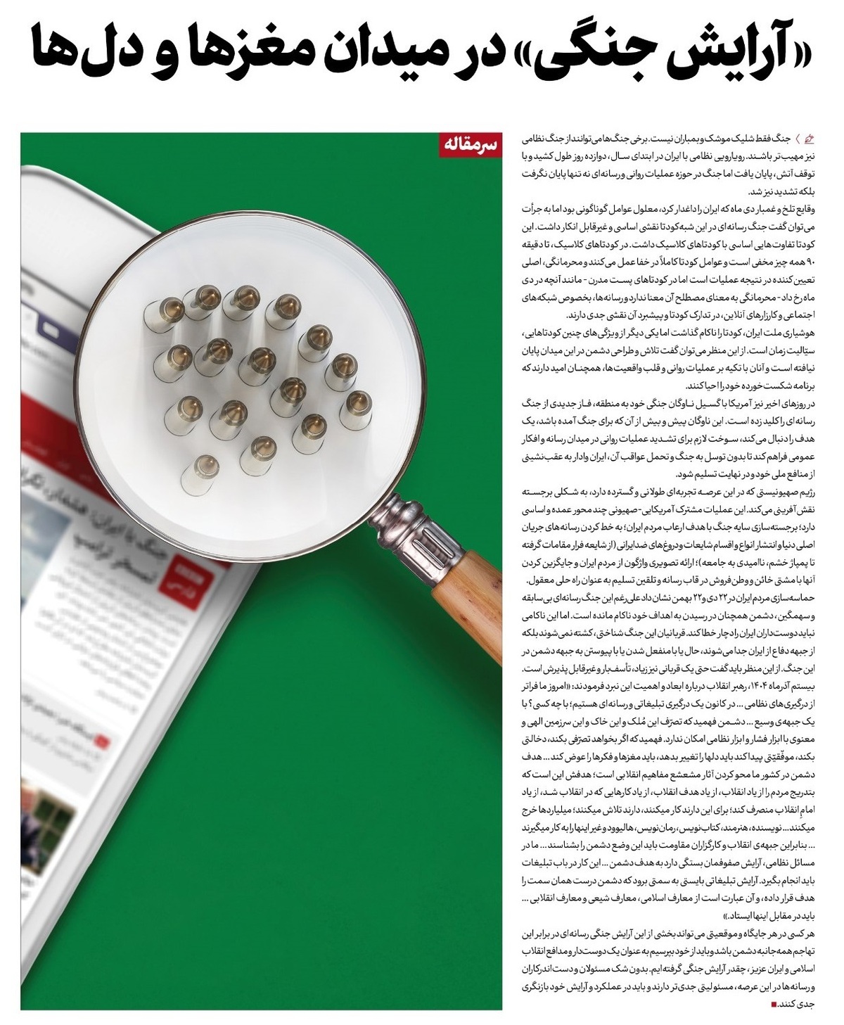 هر کسی در هر جایگاه و موقعیتی میتواند بخشی از این آرایش جنگی رسانهای در برابر این تهاجم همهجانبه دشمن باشد و باید از خود بپرسیم به عنوان یک دوستدار و مدافع انقلاب اسلامی و ایران عزیز، چقدر آرایش جنگی گرفتهایم. بدون شک مسئولان و دستاندرکاران و رسانهها در این عرصه، مسئولیتی جدیتر دارند و باید در عملکرد و آرایش خود بازنگری جدی کنند.